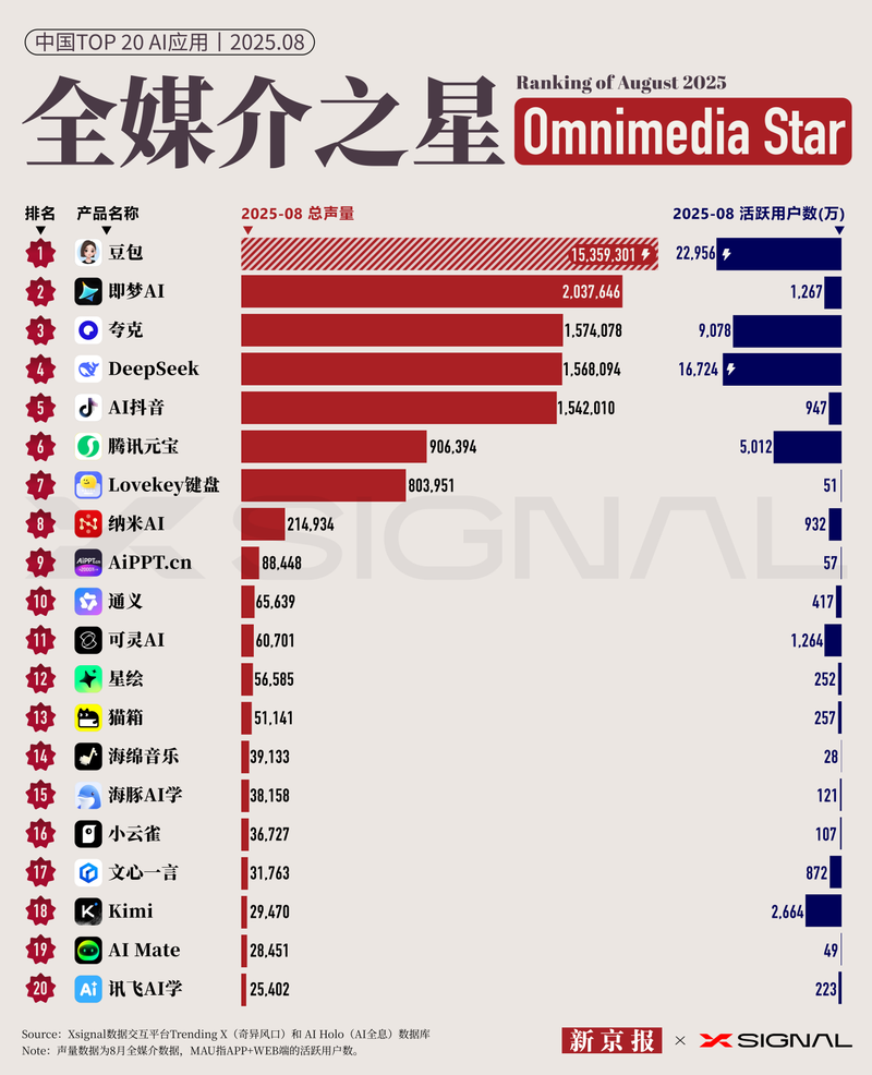 9月25日,北京新闻AI研究所和Xsignal在2025年8月共同发布了中国“ All Media Star”的AI应用清单。该清单下令2025年8月在2025年8月的20个主要国家应用程序,具体取决于AI的媒体量,并告诉MAU数据(每月活跃用户)用于应用程序。对这两个数据的比较使我们能够看到日本AI应用的开发趋势。在照片中,左侧的红色圆柱指示符是AI应用的数据(核指标是IA应用程序用户的出版物的总数,该出版物的用户的出版物总数涵盖了实时的800多个内容平台的数据。右侧的蓝色气缸指示器中的蓝色圆柱指示器是AI的每月进行的AI I Appictii and Inver Inver Inture de Inver Inter Inrubive A的每月活跃数据。怀疑的研究所,夸克(Quark)和DeepSeek在应用程序双重的双重。每月活动。您对语音数据进行了第18个分类,而每月的活动数据占第五位,这表明您的“保守力量”。从避难所中,Doubao,Jimeng AI和Quark在AI应用程序的声音量数据方面被归类为前三个。此外,在积极的月度数据方面,Doubao,Deepseek和Quark被列为前三名。其中,DePseek的语音音量略低于夸克,但仍以超过150万的排名占据第四名,这意味着Dream AI AI排名7。相对而言,Beanbao,Quark和DeepSeek的综合价值仍然脱颖而出,这表明这三个应用程序在深度深度构建了“ Moat”深度。在三个主应用程序之后,Tencent Yuanbao在Voice中排名第六,在每月活跃的用户中排名第四。信任微信生态系统,腾讯Yuanbao的声音和每月活跃的用户我与上半年的平均数据相比,八月的n八月有所改善。声音数据从上半年的690,000发射到2025年至906,000,每月活跃的用户也从4102万增加到5012万。音频排名:AI Douyin,Xiaoyunlin和Iflytek AI列为名单,而Manus,Hoshino和Iflytek AI已于今年上半年从数据中退休。 Doubao和Quark留在榜单上的前三名。此外,20个最佳音频量分类将帮助他学习加入AI Douyin,Xiaoyunqiu和Iflytek AI。同时,Manus,Hoshino和Iphilitech排名前20名,排名前20位,并列入了榜单。其中,马努斯(Manus)宣布撤出中国市场,其声音也有所下降。尽管Iflytek Spark已从列表中删除,但Iflytek的子公司Iflytek AI也参与了音频分类,并专注于AI的教育领域。在“新应用程序”中E列表,AI Douyin,Xiaoyunlin和Iflytek AI科学属于AI搜索引擎的领域,AI的视频和AI的教学和学习分别属于AI搜索引擎的领域。应用程序的开发是“满是鲜花”,这表明用户正在各个领域进行讨论。 Keling Jimeng的每月活跃用户具有相似和不同的声音。值得注意的是,在Kimi的“变更策略”之后,“视频AI模型的两个英雄” Keling AI和Jimeng AI分别具有1.264亿和1.267亿个月度活跃用户,这或多或少是相同的,但声音分别与607,000和2,037,600的声音“非常不同”。此外,在五个AI应用程序超过150万的AI应用中,有三种是法令产品,表明该条例对内容平台的影响。将声音量与每月活跃用户进行比较,您可以看到Kimi的每月活跃用户达到26.44亿,排名第五,只有29位,500声音量和18。有趣的是,与2025年数据的上半年相比,Kimi Audio量逐年减少(2025年上半年的350,000),而每月活跃的用户每年又一年又一年又一年又一年又一年又一年地增加了(在2025年的上半年2.53亿)。此前,在北京新闻AI研究所的一项研究中,他说他不再在C结束时寻找激进的“投资”,而是会加深基本模型和研究技术。这种战略变化也反映在八月的数据列表中。生产者:byjing新闻AI研究所,XSignalReport作者:Lu Yidan的编辑Wang Jininu测试纠正lu Qian