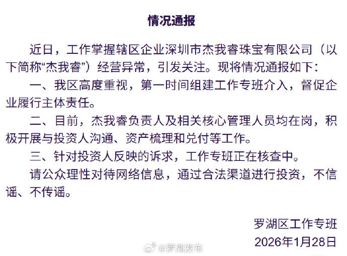 作者:bat365在线平台官网2026年2月1日2026年2月1日对“在水贝易黄金预售平台提款难吗?深圳罗湖区:专项工作组正在核实 – 新京报”作出评论 新京报1月28日,@罗湖在微博上发布了通报。全文如下: 据此前媒体报道,杰瑞名下的“杰瑞珠宝”及多家相关网络平台“隆冶金”、“金城黄金世界”(以下统称“杰瑞网络平台”)近期出现支付困难的情况,影响了众多投资者。据投资者自行统计,资金余额超过100亿元。编辑 申真