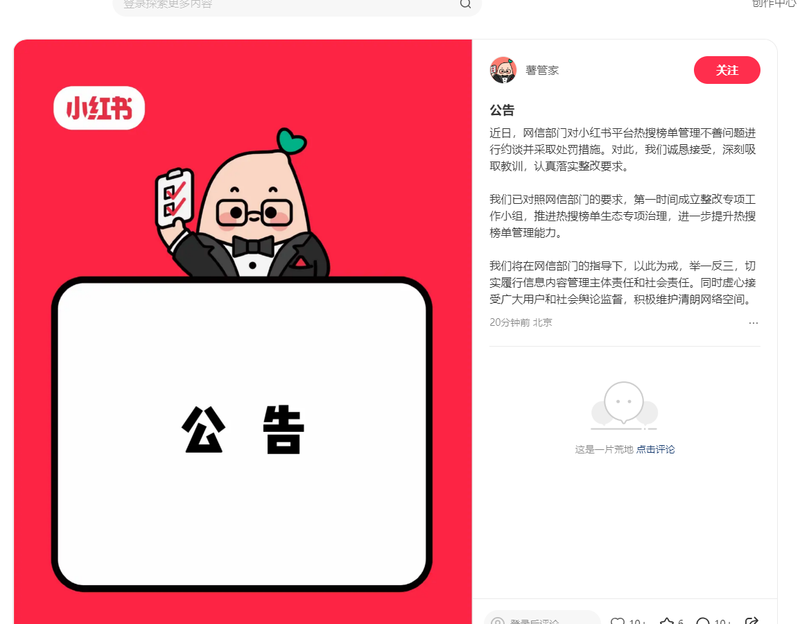 北京新闻(News)于9月11日宣布了小苏·波特伊·巴特勒(Pottoy Butler)的宣布。演示文稿的原始文本如下:最近,互联网信息部采访并惩罚了不当管理Xiaohongshu搜索列表的问题。从这个意义上讲,我们真诚地接受,我们学习深度课程并实施诚信的纠正要求。我们比较了互联网信息部的要求,我们尽快建立了特殊的修订小组,以促进热门搜索列表的特殊生态治理,并更加改善热门搜索列表的管理能力。在互联网信息部的指导下,我们将其作为警告,我们从一个示例中学习,并认真履行信息内容管理的主要和社会责任。同时,ADWE谦虚地选择用户监督和社会公众舆论,并积极保持清晰明确的Cyberspace。其他措施:热门搜索列表通常会介绍来自多个夸张名人的个人更新和其他信息。小苏平台受到编辑陈·扬丁(Chen Yanting)的惩罚